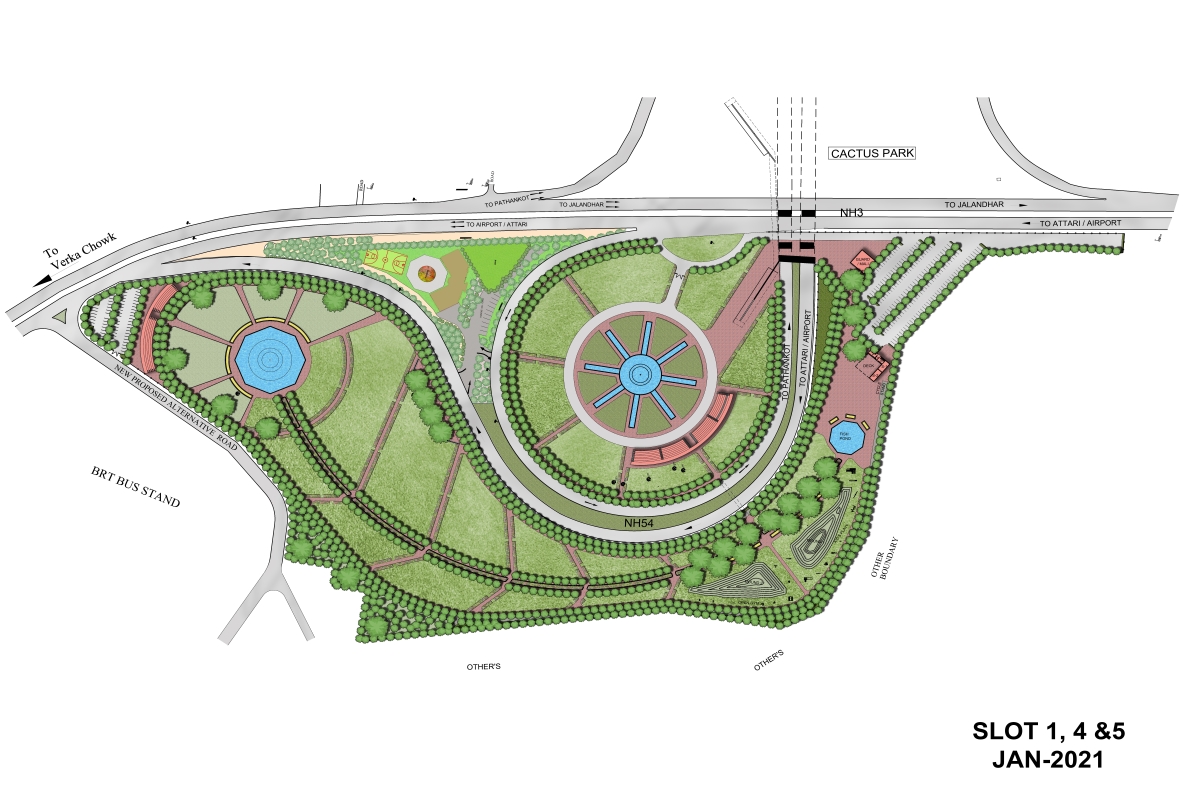 The newly constructed Junction of NH 3 (to Attari Border) and NH 54 (to Pathankot) has generated 7 slots totaling 63 acres. We have succeeded to interlink 4 large slots 1, 2 3, & 5 with one FOB for seamless pedestrian movement. The remaining 3 smaller slots are used independently. Slot 6 is developed as Kids Play Area for the neighborhood and the Slot 7 is for planting large trees. Slot 4 is for NHAI Office of Amritsar Unit. NHAI Chairman Dr. S.S. Sandhu is the force behind this unique project under Green Highways. The Cactus Park on Slots 2 & 3 is the first in Punjab.