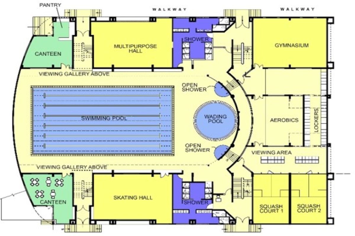 This is phase II of the project. We have a set of Squash Courts. A 25 m Pool. A Multi-Purpose Hall plus a battery of coach rooms and independent Admin / Control. We designed this in such a way that during non-school hours / days it can be made available to ‘others’ / outsiders – so that such a rare infrastructure in the city of Meerut then, has better utilization. Eventually, the ‘others’ outnumbered the school children at the sports complex – though at different times.